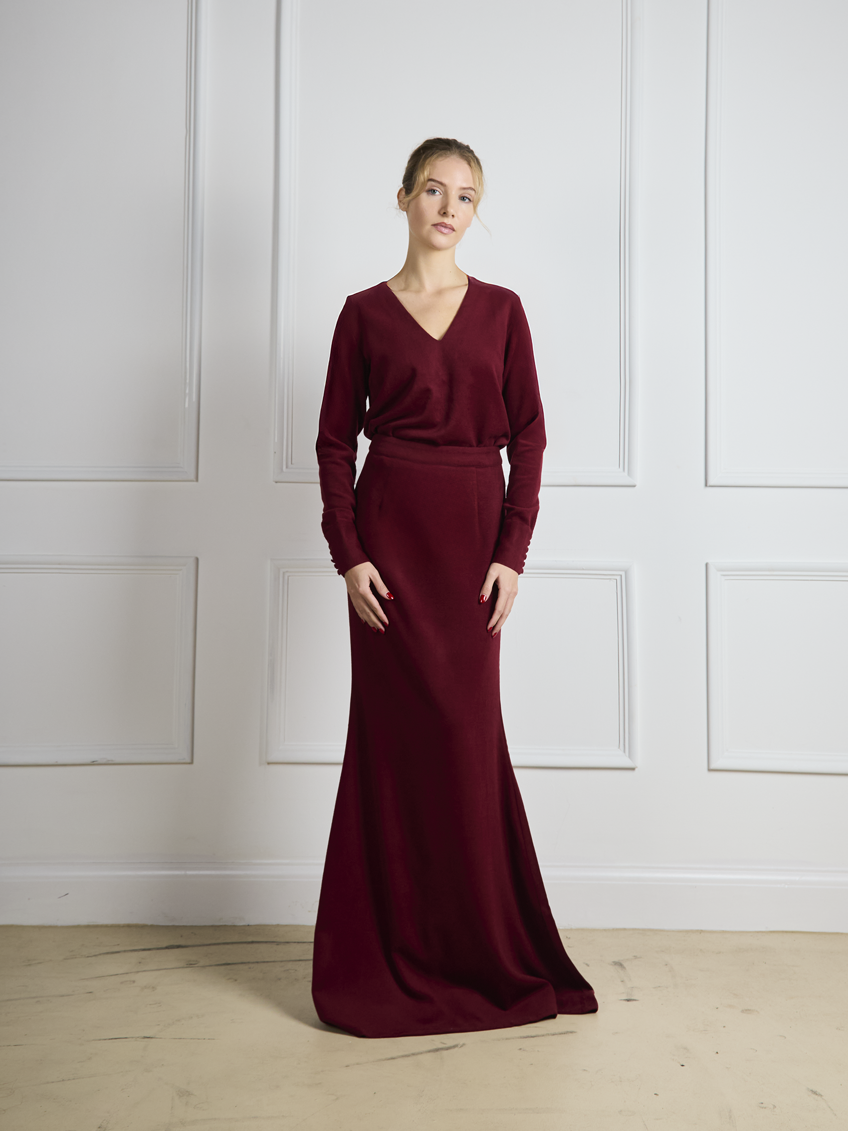 The Sienna maxi skirt in Cherry is tailored in a wool–silk blend that falls smoothly from a high-waisted cut into a straight, elongating silhouette. Designed to sit close at the waist and drape with ease through the body.